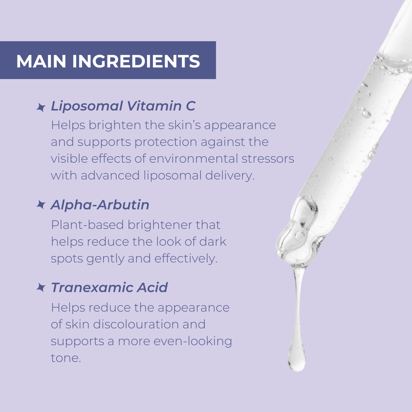 This lightweight, water-based serum blends liposomal Vitamin C, Alpha Arbutin, and Tranexamic Acid. Together, they help skin look brighter, reduce the appearance of dark spots, and restore clarity.