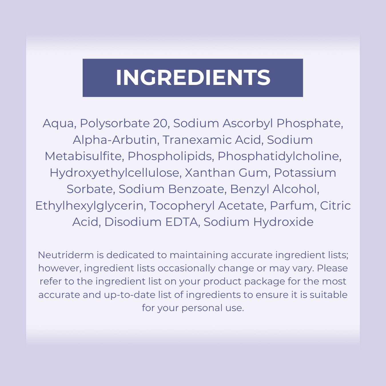 Neutriderm is dedicated to maintaining accurate ingredient lists on our website; however, ingredient lists occasionally change or may vary. Please refer to the ingredient list on your product package for the most accurate and up-to-date list of ingredients to ensure it is suitable for your personal use.