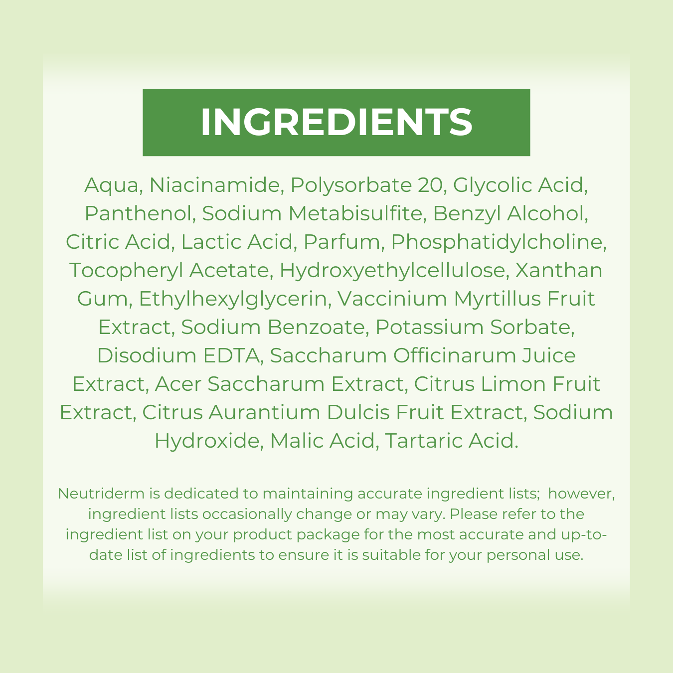 Neutriderm is dedicated to maintaining accurate ingredient lists on our website; however, ingredient lists occasionally change or may vary. Please refer to the ingredient list on your product package for the most accurate and up-to-date list of ingredients to ensure it is suitable for your personal use.