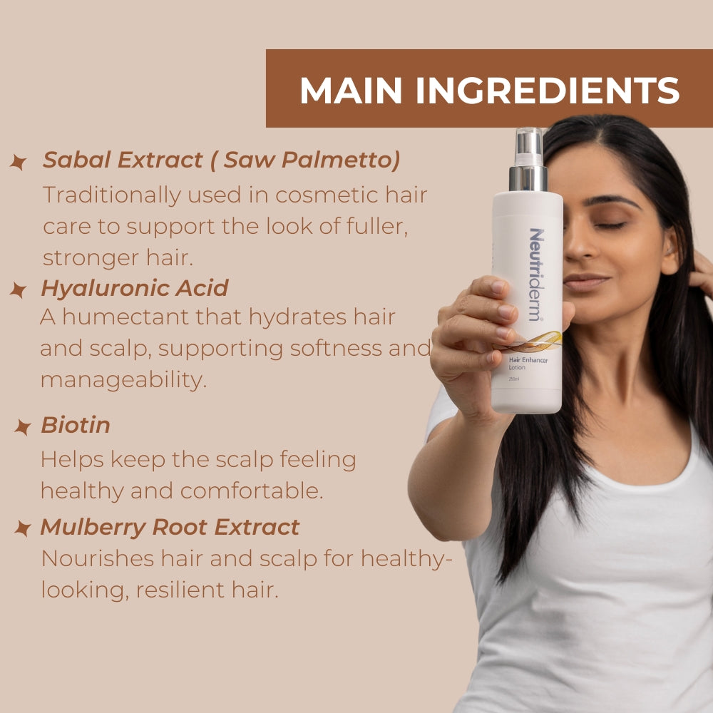 Neutriderm Hair Enhancer Lotion is a targeted leave-in treatment designed to complement your regular shampoo and conditioner regimen. This advanced, evidence-based formula features sabal extract (saw palmetto) and a blend of specialised ingredients, carefully chosen to hydrate, exfoliate, and nourish your scalp, creating the optimal environment for hair that looks and feels thicker and more resilient.