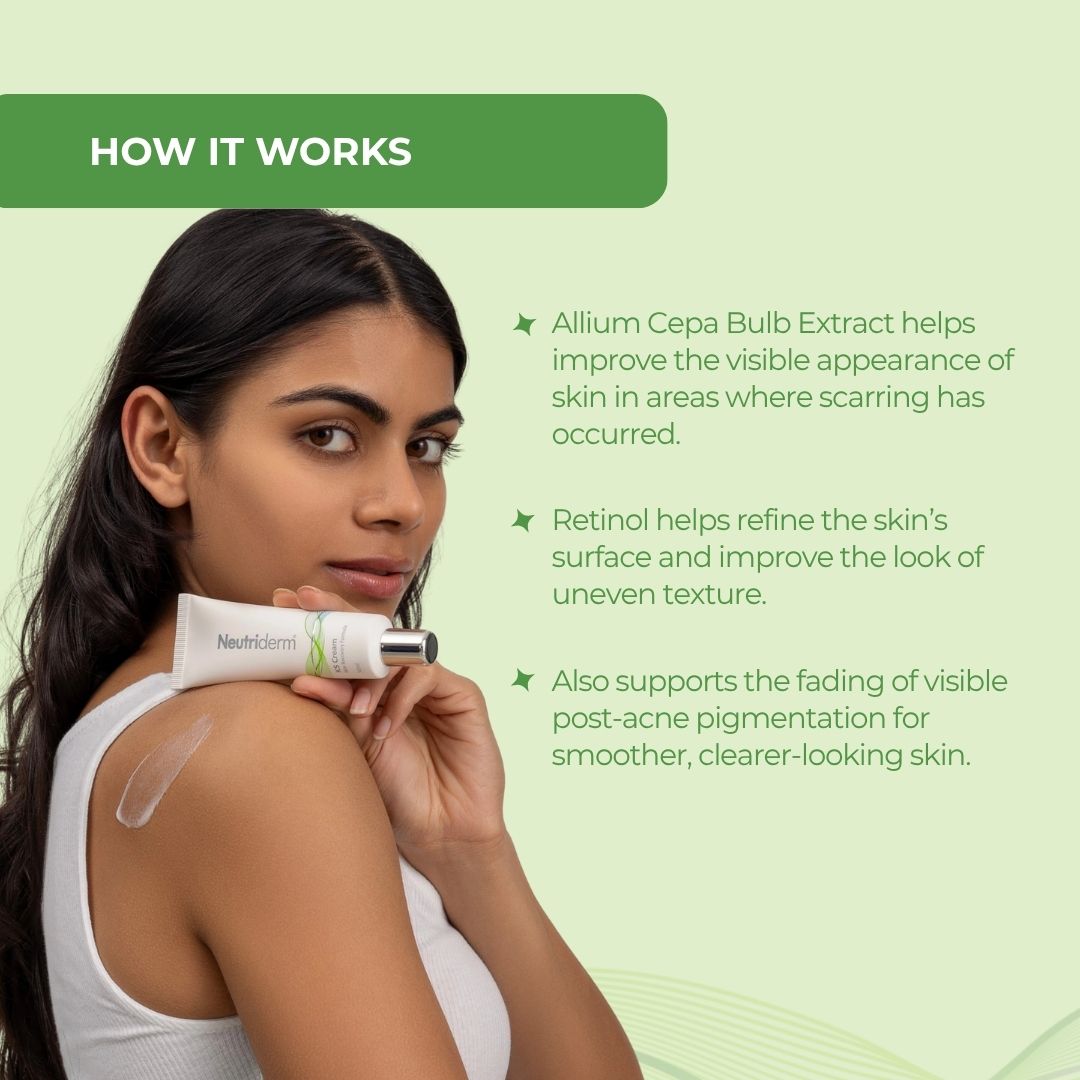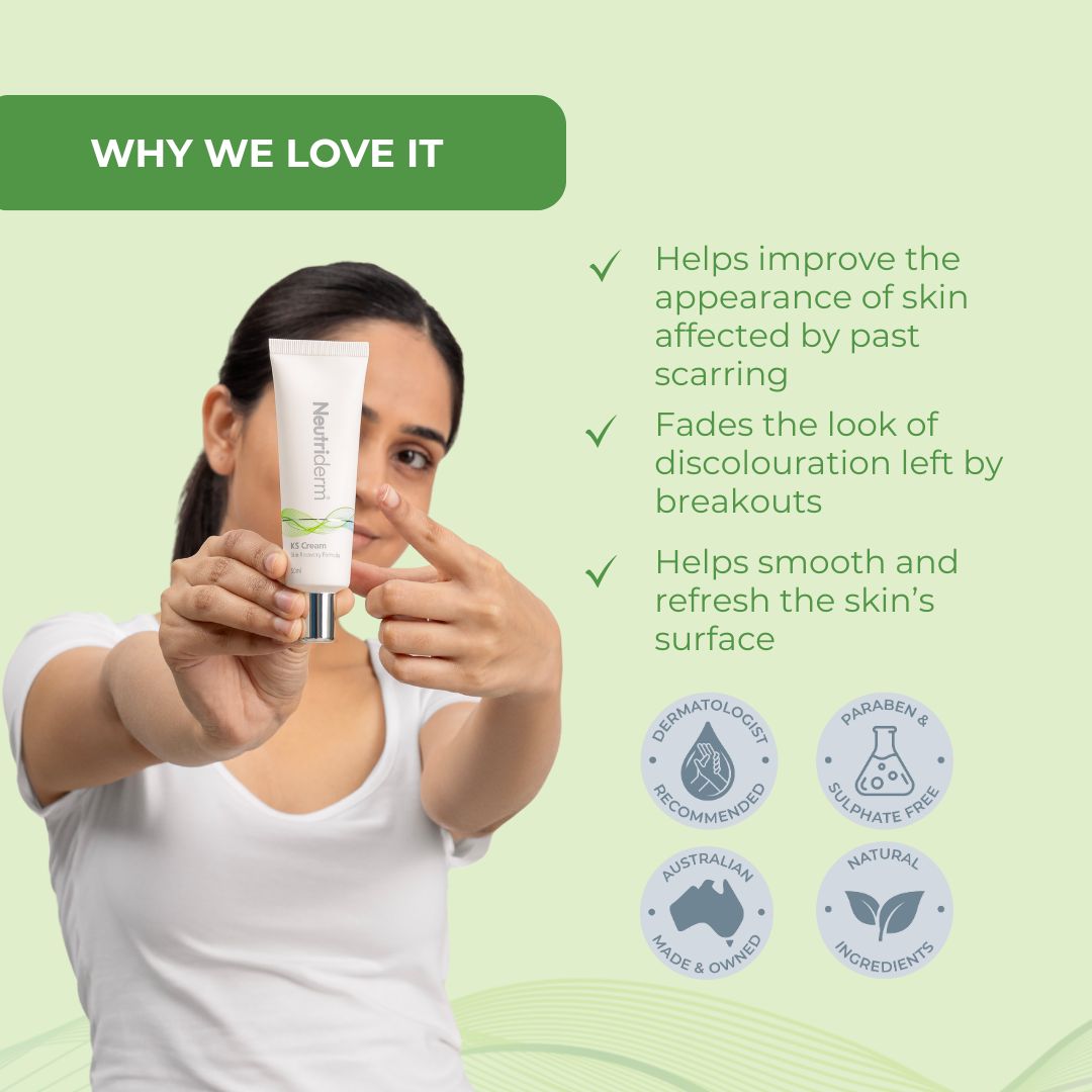 Neutriderm KS Cream is an advanced cosmetic formula designed to help visibly soften and improve the appearance of scars, acne marks, and stretch marks. Powered by a blend of cosmetic actives, this lightweight cream supports smoother, more even-looking skin.