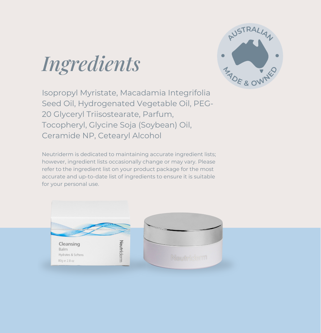 This rich cleansing balm melts into a gentle oil when massaged onto dry skin, helping to dissolve makeup, sunscreen and impurities with ease. Enriched with Vitamin E, Soybean Oil, and Ceramide NP, the texture feels nourishing and comforting while rinsing cleanly with water.