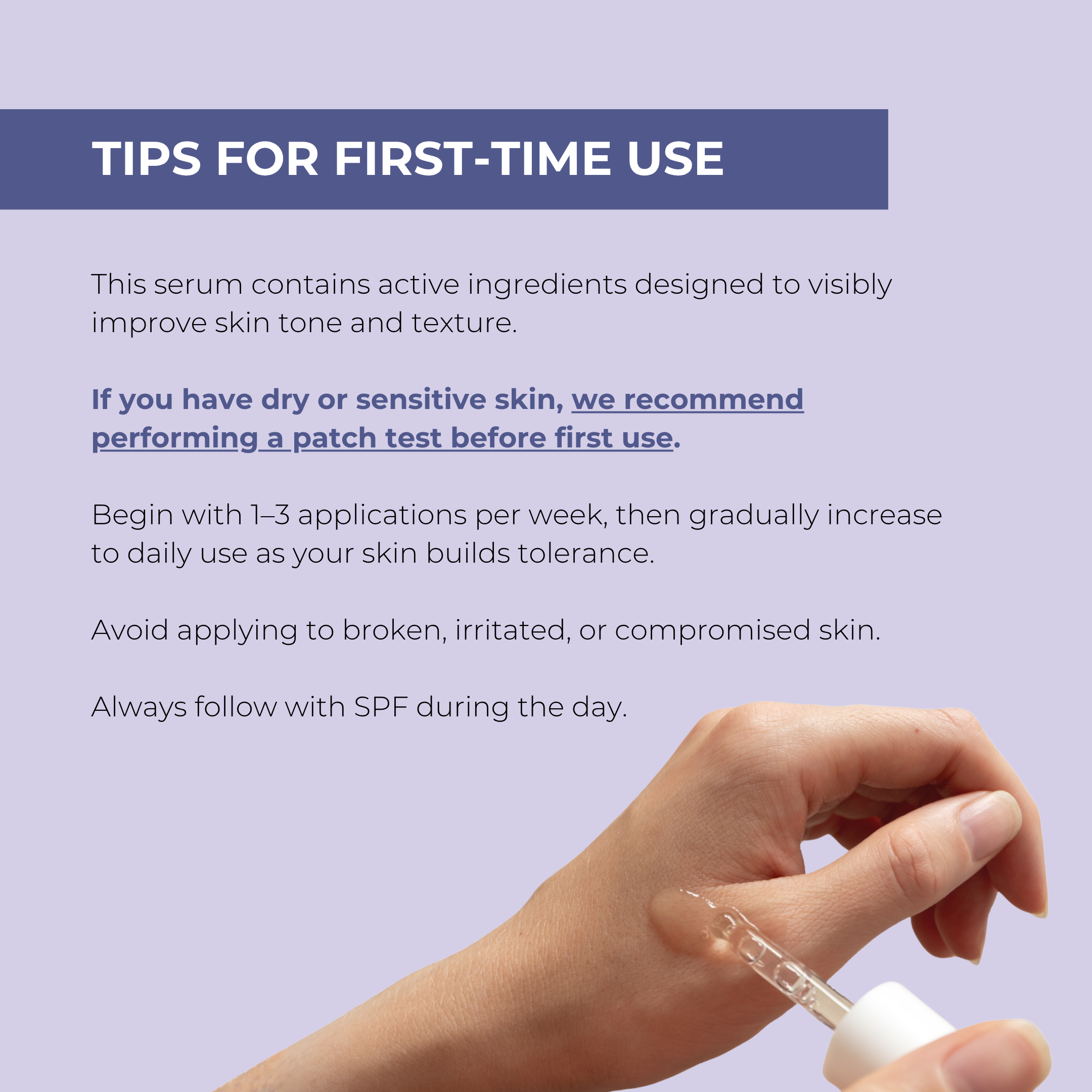 We recommend doing a patch test first and starting with 1–3 uses per week, then building up to daily application if your skin tolerates it well. This helps your skin adjust and ensures you get the best results without irritation.