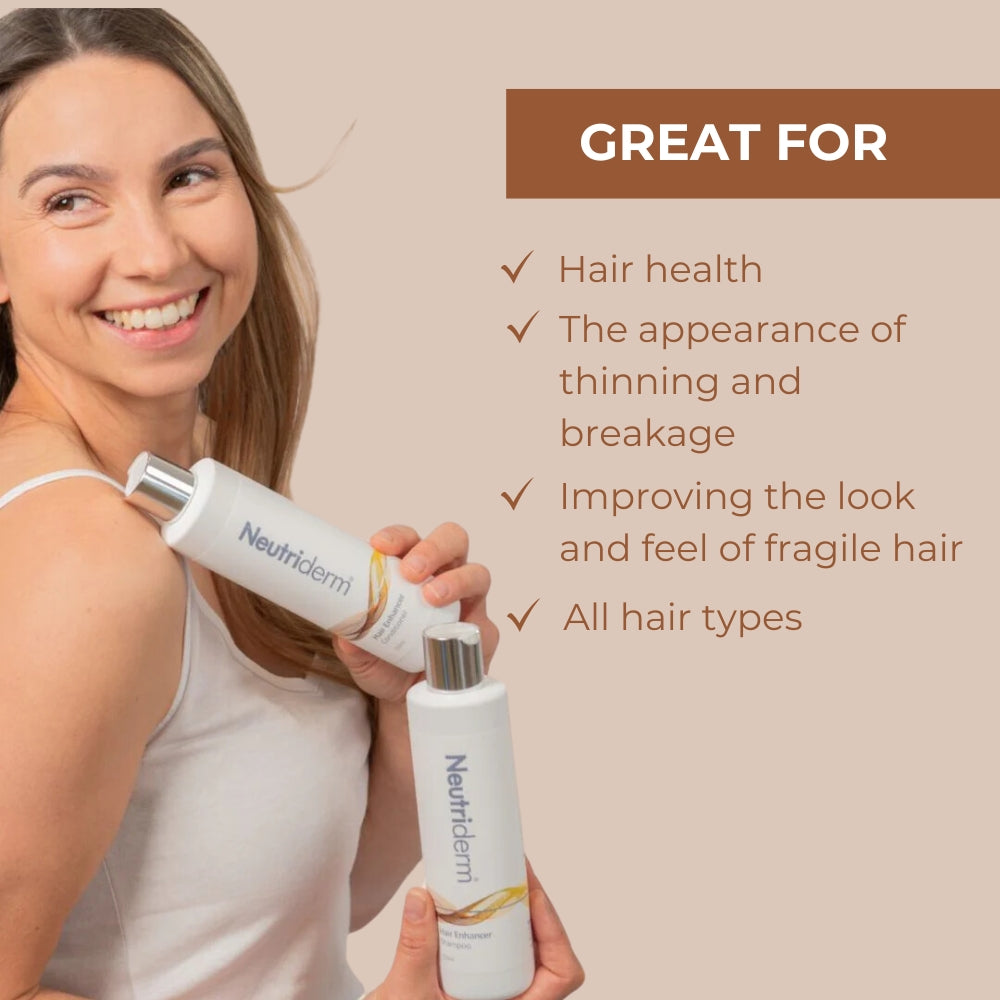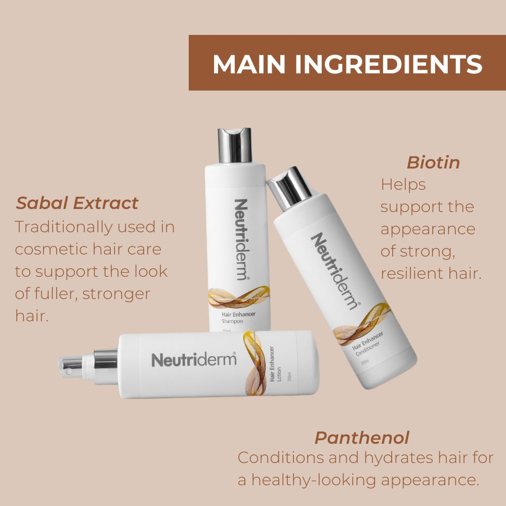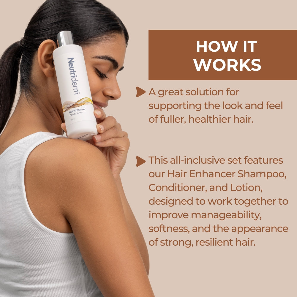 Neutriderm Volumising 3 Piece Set brings together three advanced, evidence-based formulas for your complete hair wellness ritual. This bundle includes the Hair Enhancer Shampoo, Conditioner, and Lotion, all designed to gently cleanse, deeply condition, and provide targeted leave-in nourishment for hair that looks and feels naturally fuller, softer, and healthier.