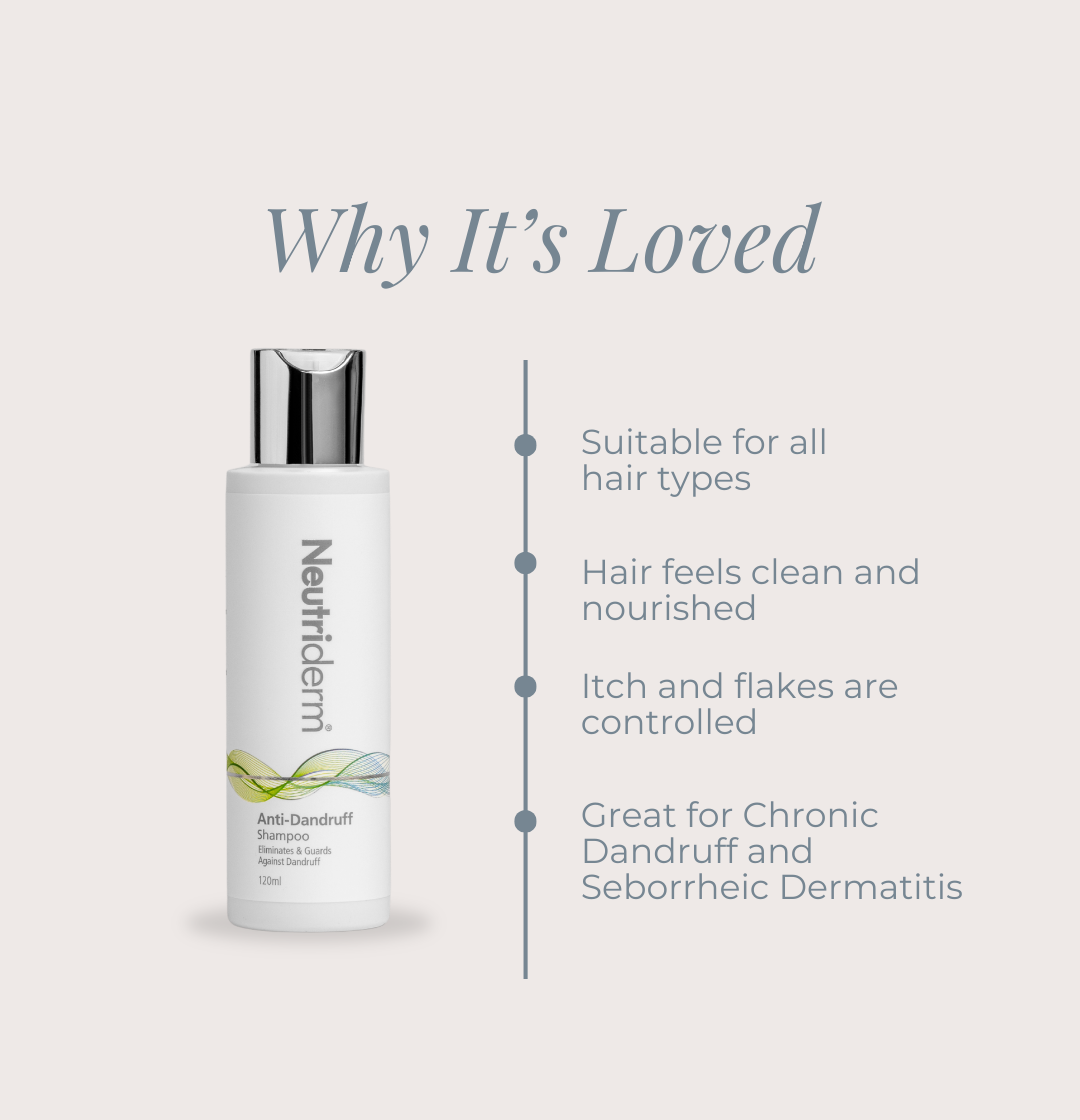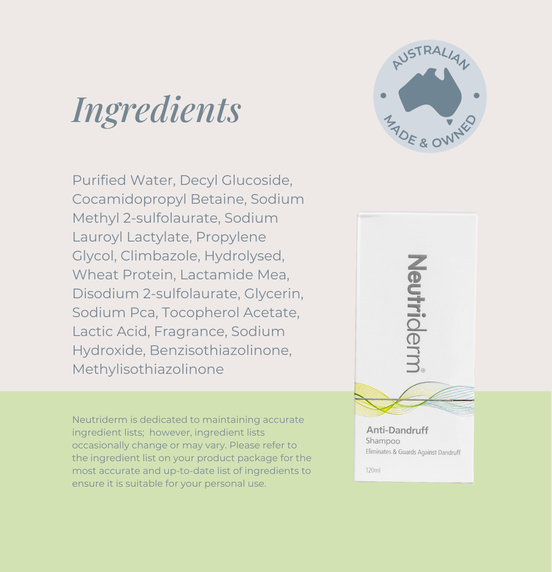 Neutriderm Anti Dandruff Shampoo is an award-winning cosmetic shampoo formulated with 1% climbazole to help minimise the appearance of visible flakes while supporting scalp comfort.