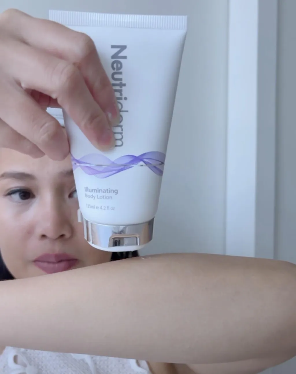 For body care, apply Neutriderm Illuminating Body Lotion daily to help hydrate, smooth, and support a more even-looking skin tone.